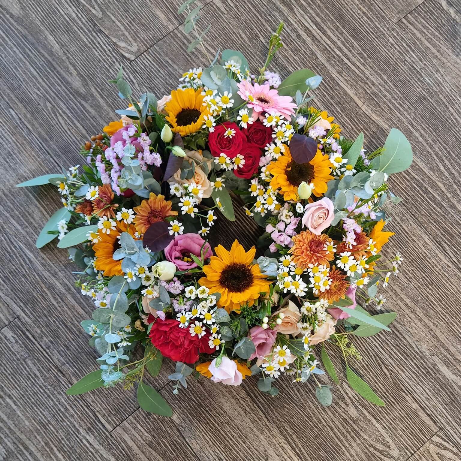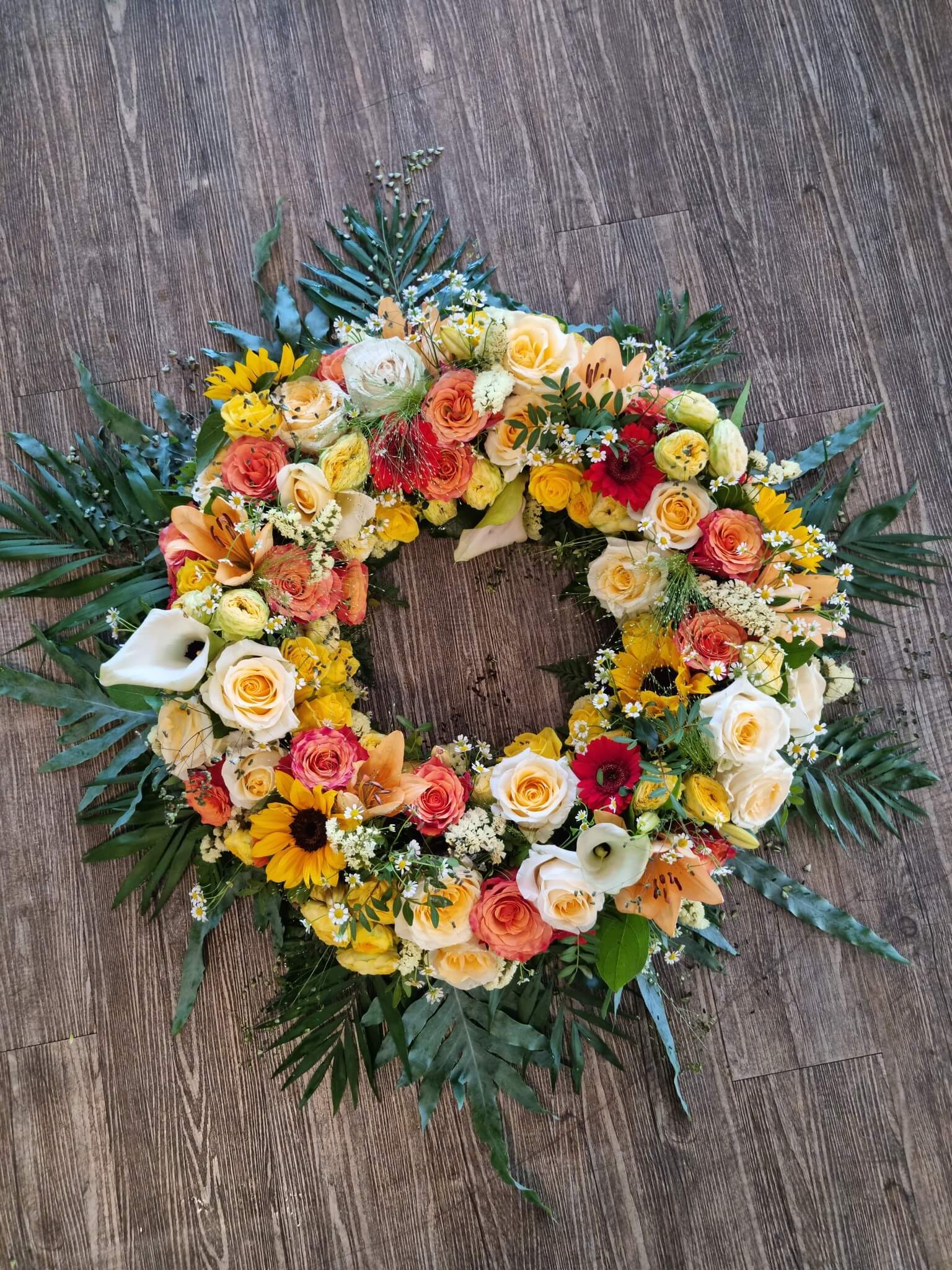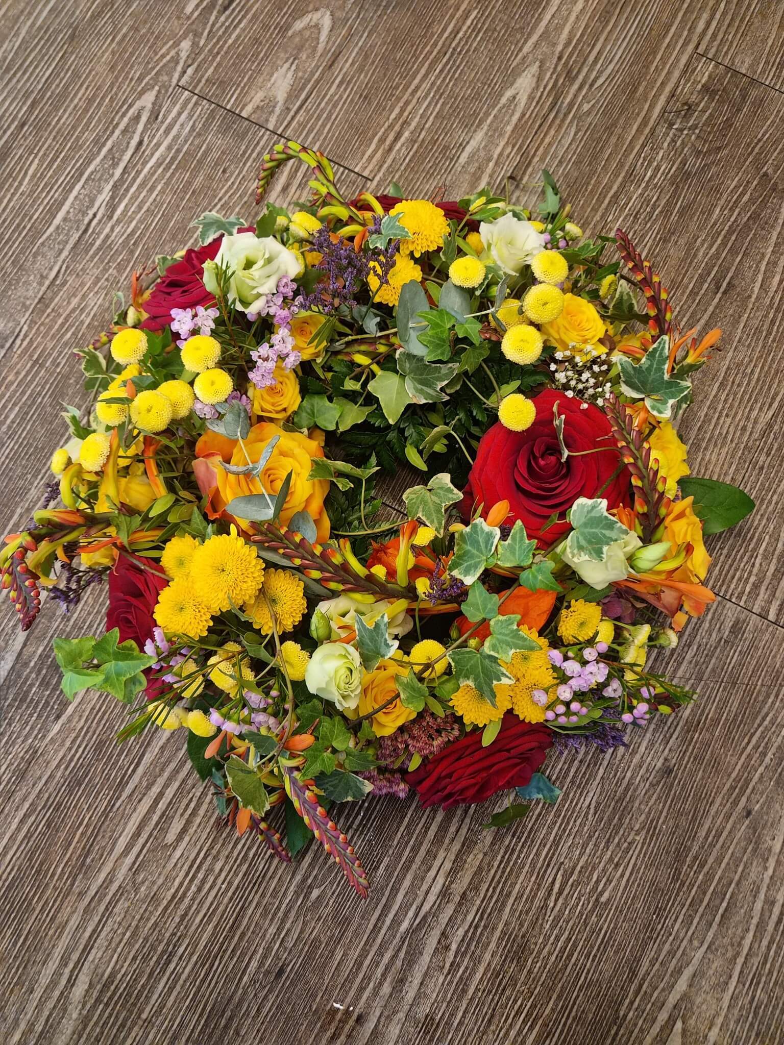 Sargbouquet, Rundgesteckte Kränze, Bouquet Kränze, Altargestecke, Kirchenschmuck, Pflanzschalen, Urnenkränze & Grabblumen.